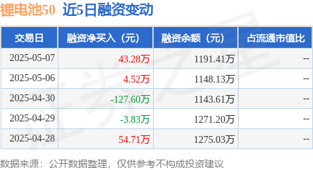 锂电池50:5月7日融资买入165.55万元,融资融券余额1191.41万元